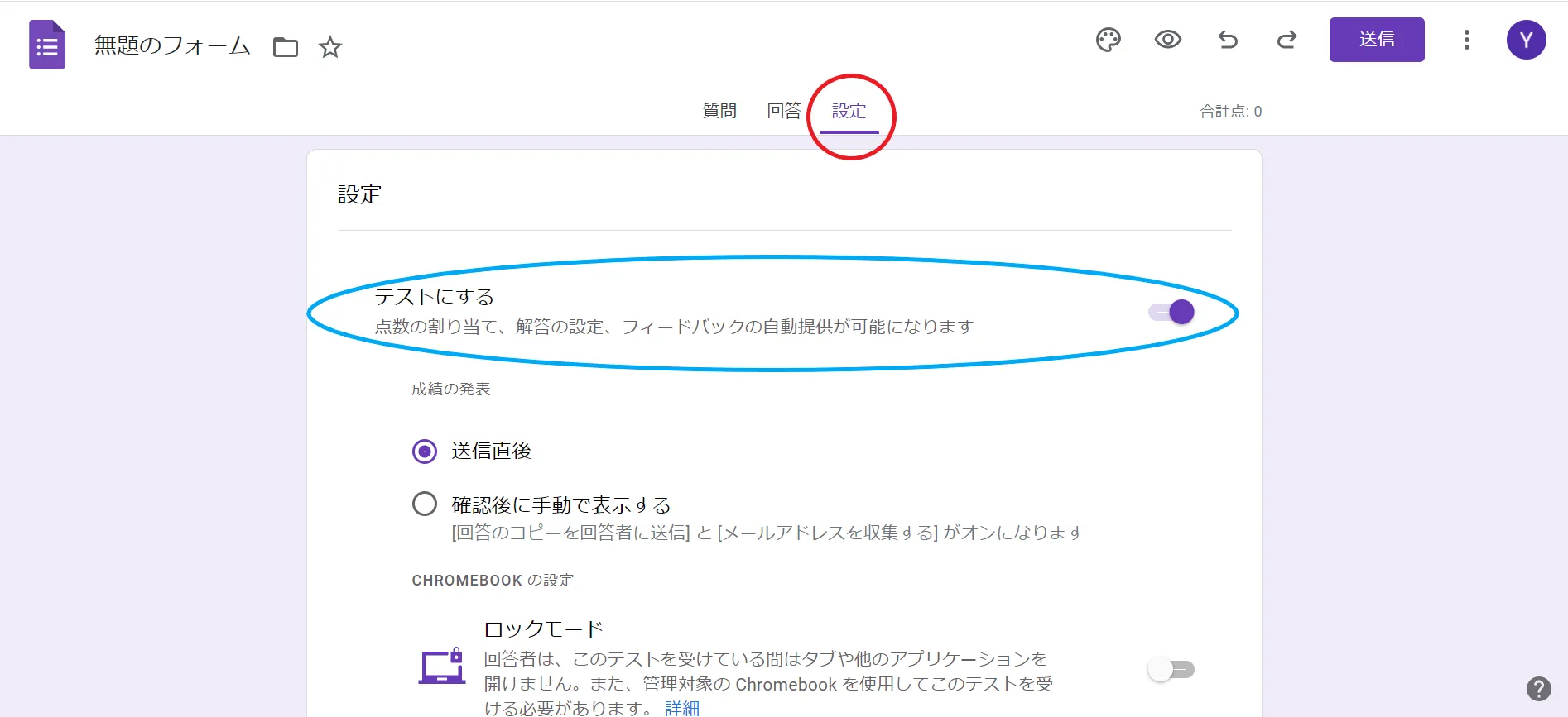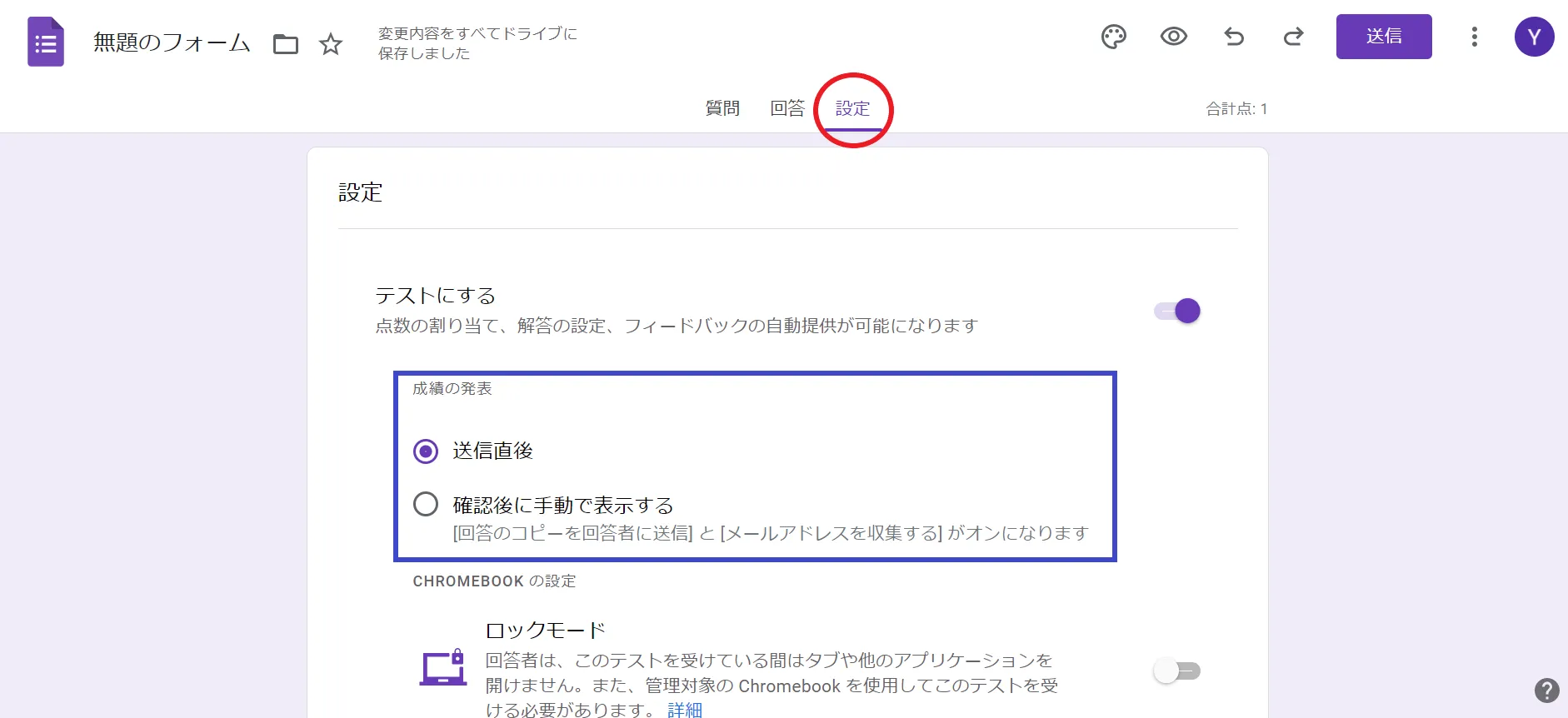 上のバーの「設定」(下図赤丸)をクリックし,「成績の発表」のタイミングや「回答者の設定」から回答者が確認できる情報を設定することもできます.
