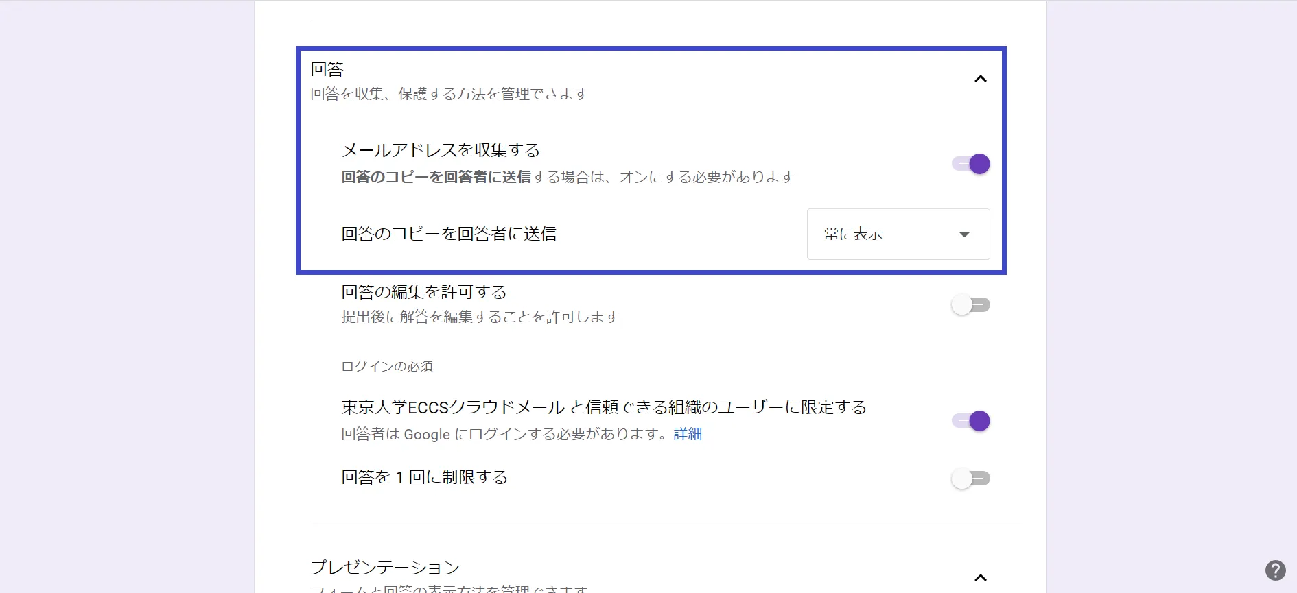 - 「東京大学ECCSクラウドメールと信頼できる組織のユーザーに限定する」がオンになっていることを確認します.なお「メールアドレスを収集する」を選択しておくと,回答者のECCSメールアドレスが自動的に記録されます.