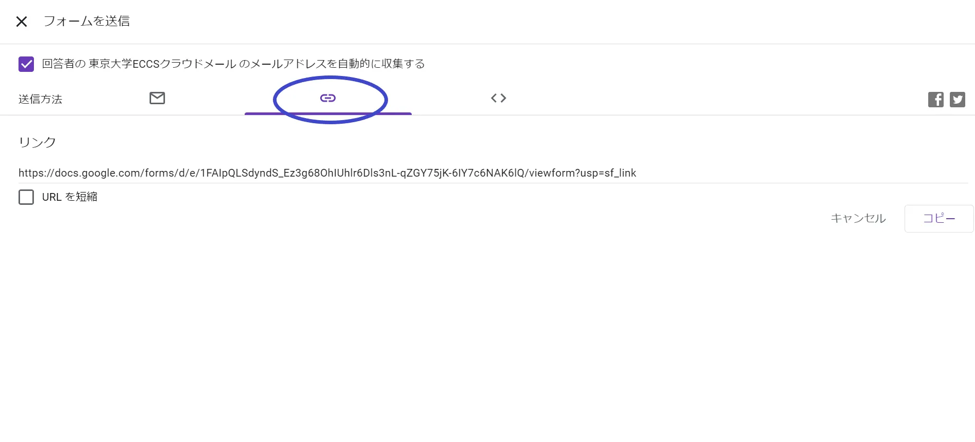 右側の「送信」をクリックし,下図の⻘丸で囲まれたリンクマークをクリックするとリンクが出てきます. このリンクを「コピー」し,UTOLやZoomのチャット欄にペーストして共有します.