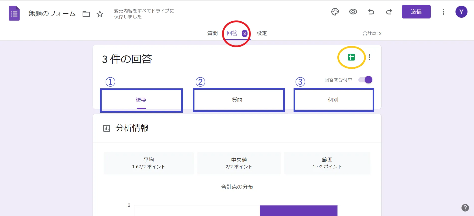 回答はスプレッドシートのマーク(下図オレンジ丸)のマークをクリックすることで対応するスプレッドシートが自動で生成sされ,表形式で確認・ダウンロードすることも可能です.