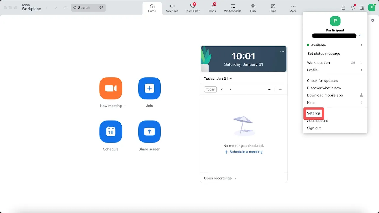 1. Click the icon in the upper-right corner of the Zoom app window and select “Settings”.