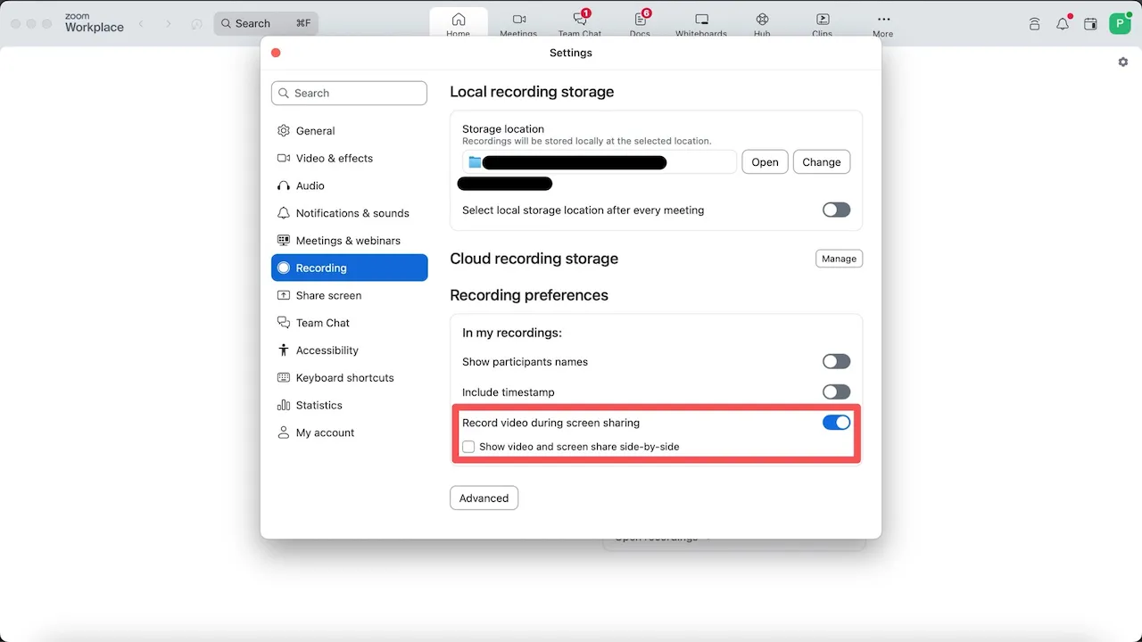 3. Enable “Record video during screen sharing”.