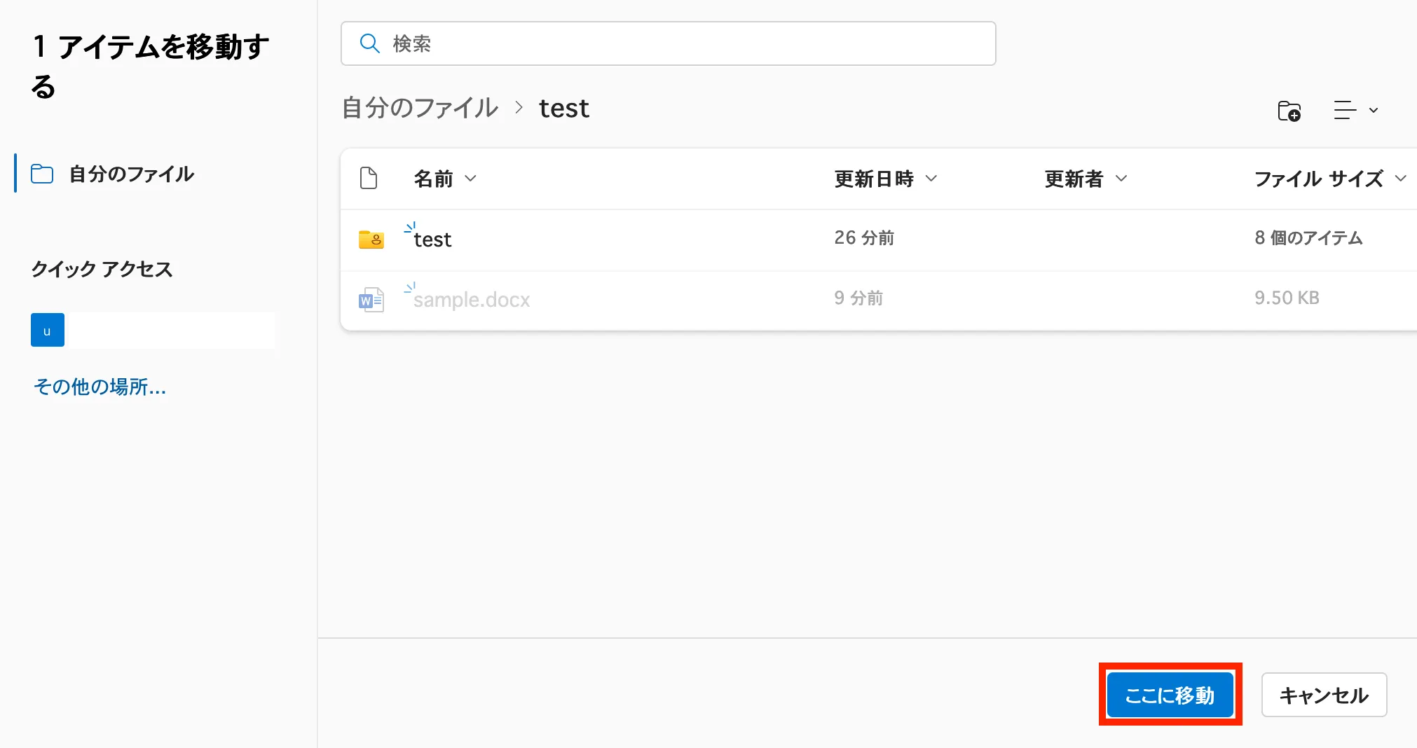 - 画面下部の「ここに移動」を押してください.選択したフォルダにファイルが移動されます.