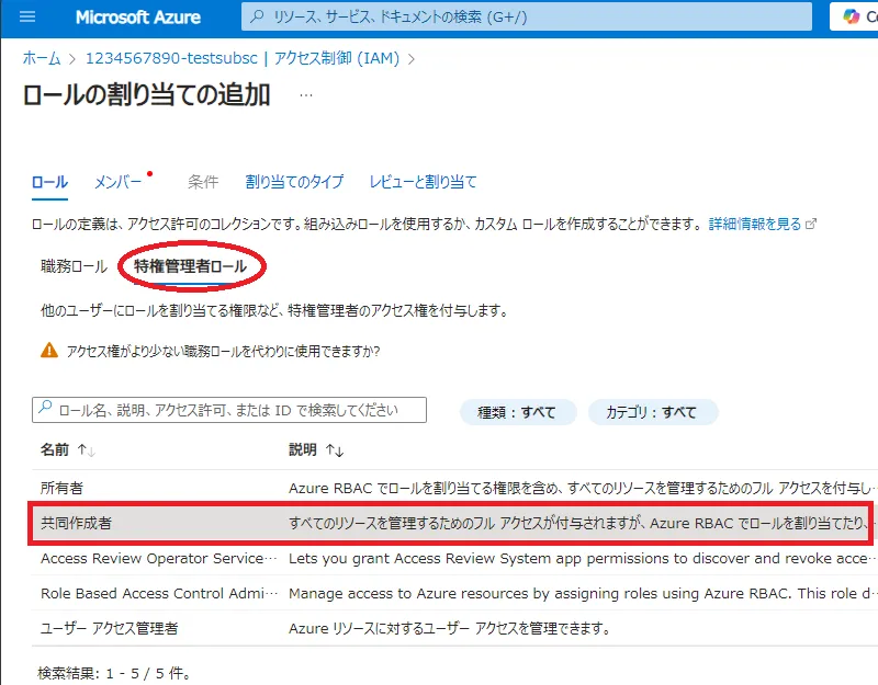 以下の手順で各スコープにロールを割り当てます.ここでは共同作成者の手順を示しますが,所有者も同じ手順(一部追加手順あり)なので,所有者の割り当ての場合は読み替えてください.