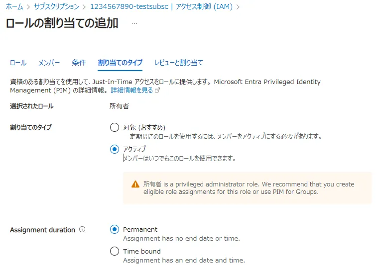 • Assignment DurationPermanentを選択してください.※ライセンスの都合上Time boundは現時点では選択しないようお願いします.