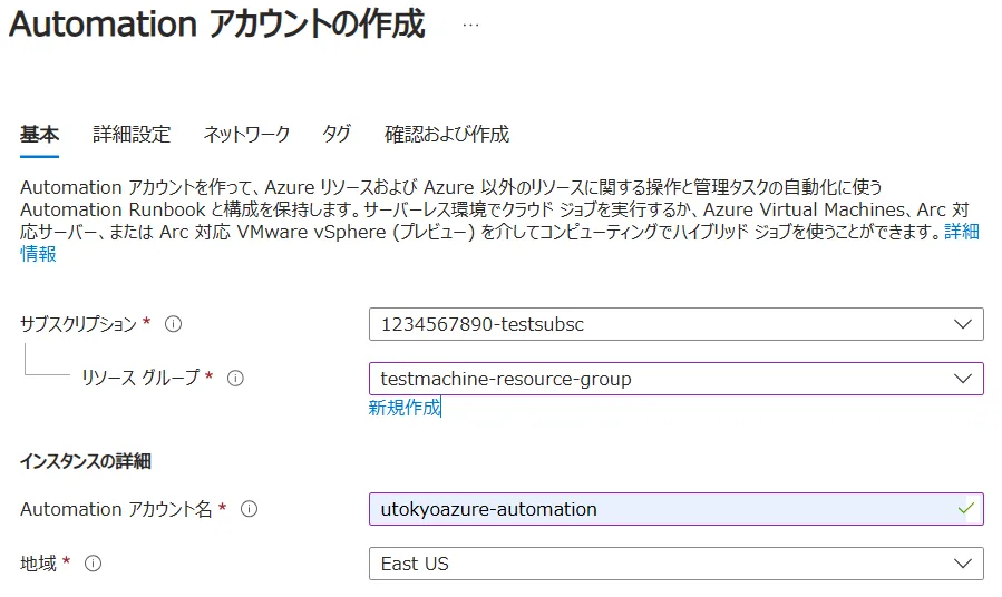 testmachine-resource-groupを指定します. - リージョン:グローバルのままで構いません.
