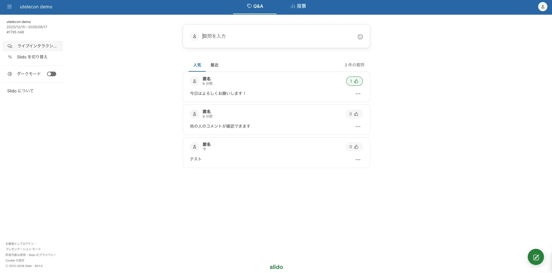 - 受講者からの質問を確認したり,投票を行ったりする.具体的な手順は「Slidoで主催者ができること」をご覧ください.