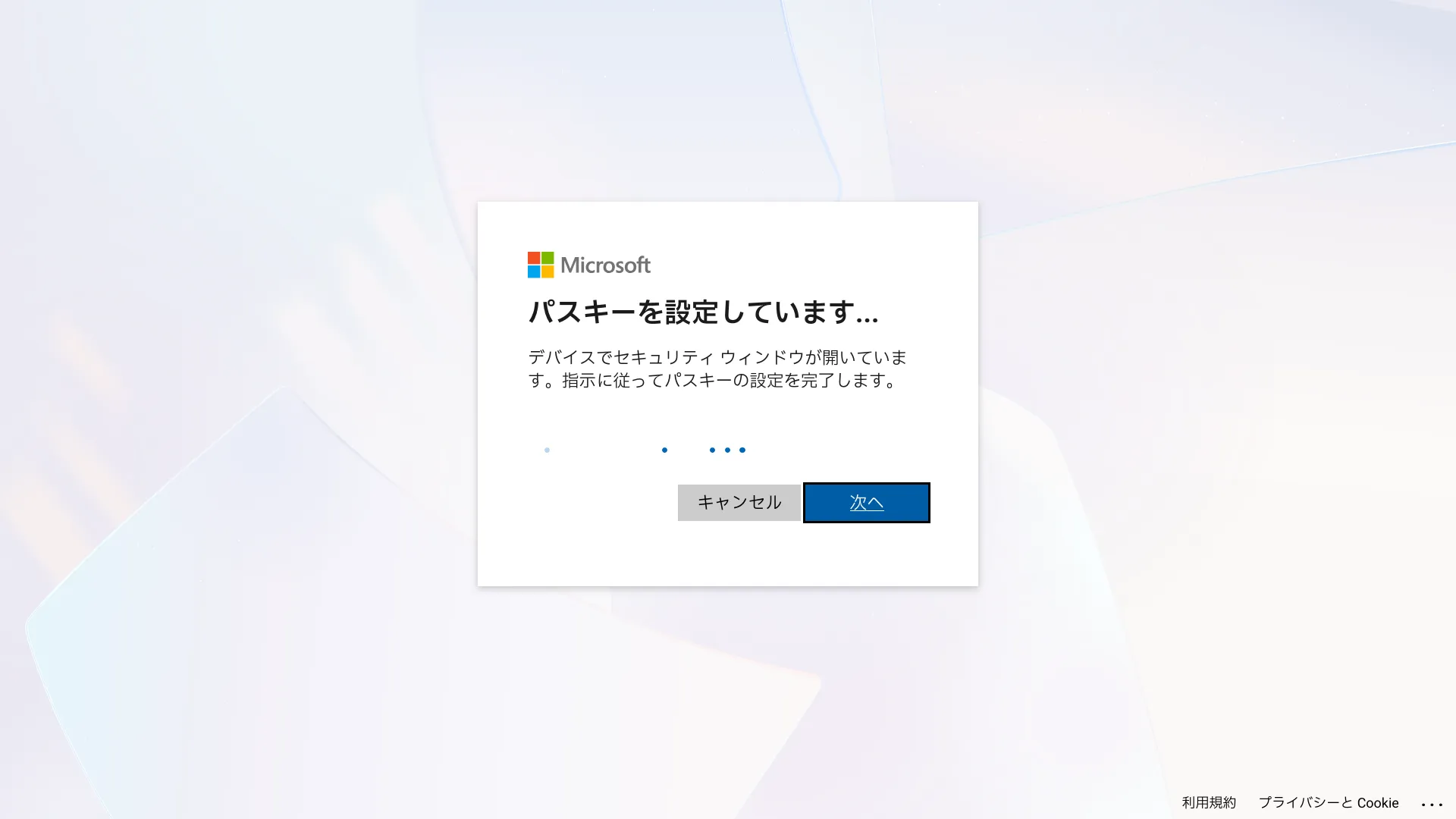 画面が遷移し,「パスキーを設定しています」という画面が表示されるので,「次へ」を押してください(自動で 6. に進むこともあります).