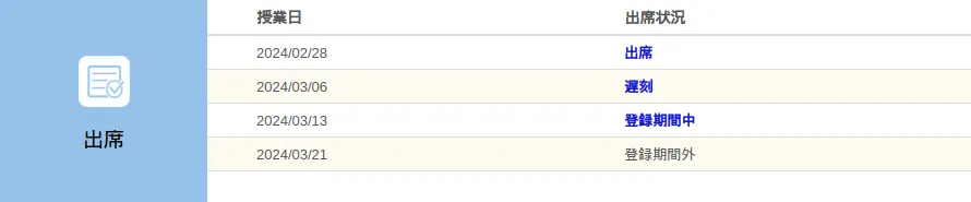 過去の出席は,コーストップ下部の「出席」欄に「出席」「遅刻」「欠席」等の形式で表示されます.