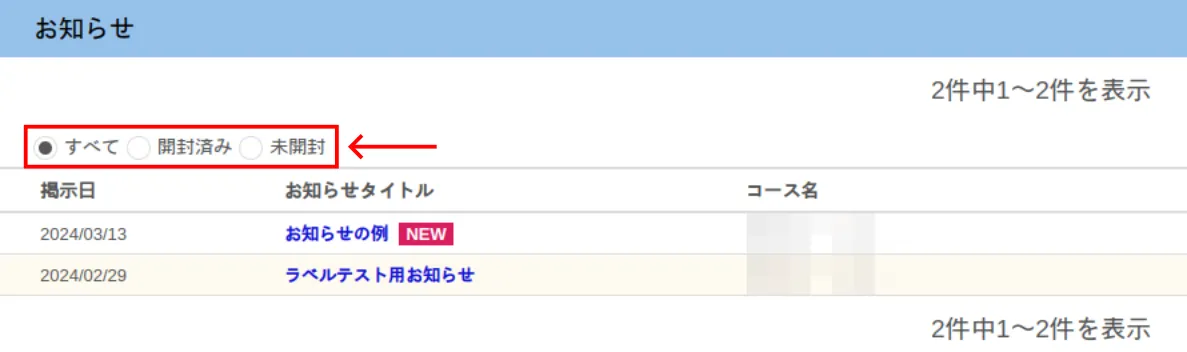 お知らせ一覧・更新通知一覧では,受講しているコースのお知らせや更新通知を一覧表示できます.