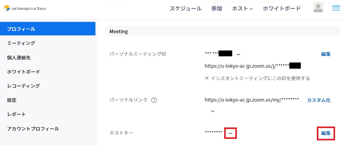 2. “Meeting”欄まで移動し,「ホストキー」の横にある瞳のアイコンをクリックしてください.表示された6桁の数字がホストキーです.