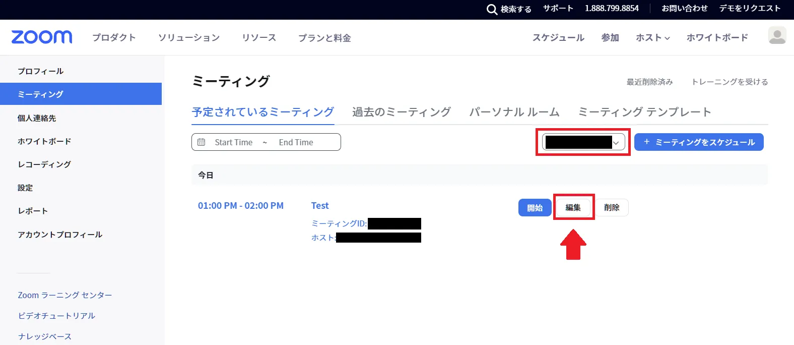 2. 新しくスケジュールするミーティングに代替ホストを設定する場合は「ミーティングをスケジュール」を選択してください. 既に作成したミーティングに代替ホストを追加する場合は,「予定されているミーティング」を選択し,一覧に表示されているミーティングにカーソルを合わせてください.新しく「編集」が表示されるのでこれを選択してください.