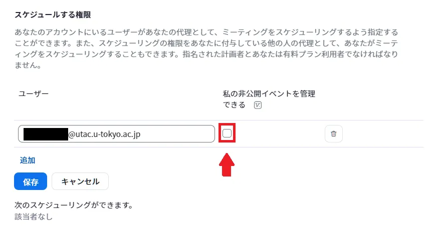 • 教員である自分が主催するミーティングについて,秘書にあらかじめスケジュールを行ってもらうため,スケジュール作成特権を付与する.